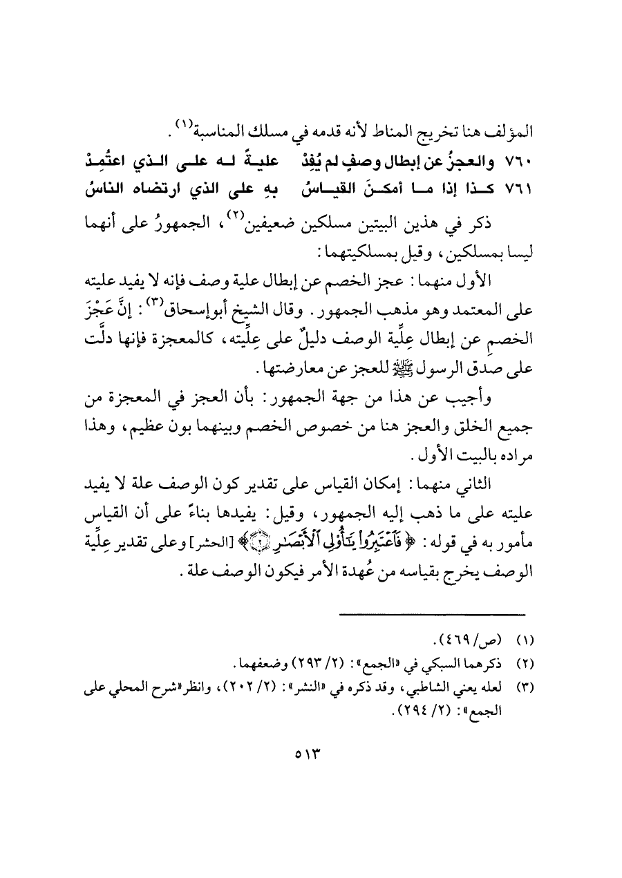 الأول منهما: عجز الخصم عن إبطال علية وصف فإنه لا يفيد عليته على المعتمد وهو مذهب الجمهور. وقال الشيخ أبو إسحاق (¬٣): إنَّ عَجْزَ الخصمِ عن إبطال عِلِّية الوصف دليلٌ على عِلِّيته، كالمعجزة فإنها دلَّت على صدق الرسول -صلى اللَّه عليه وسلم- للعجز عن معارضتها.