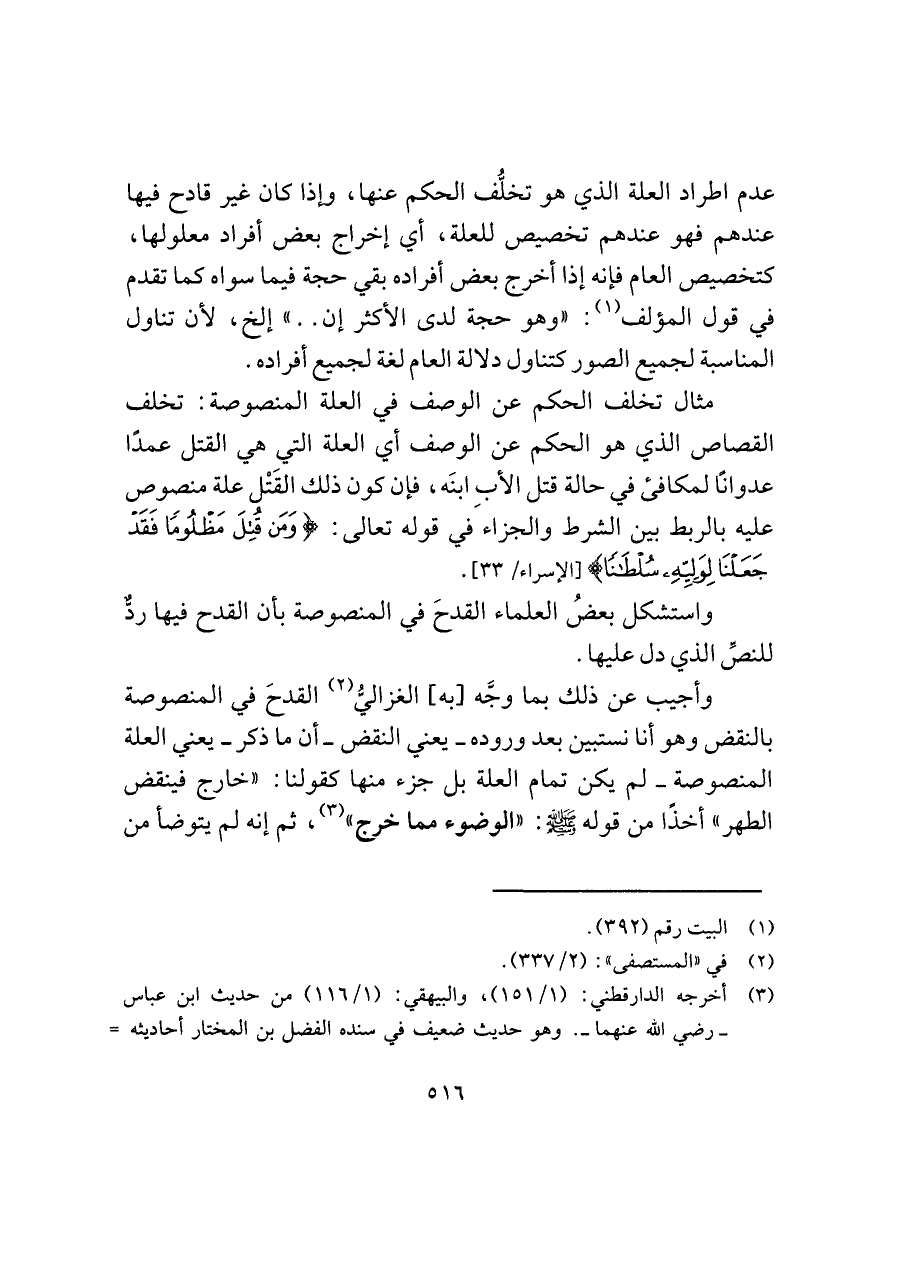 وأجيب عن ذلك بما وجَّه [به] الغزاليُّ (¬٢) القدحَ في المنصوصة بالنقض وهو أنا نستبين بعد وروده -يعني النقض- أن ما ذكر -يعني العلة المنصوصة- لم يكن تمام العلة بل جزء منها كقولنا: "خارج فينقض الطهر" أخذًا من قوله -صلى اللَّه عليه وسلم-: "الوضوء مما خرج" (¬٣)، ثم إنه لم يتوضأ من