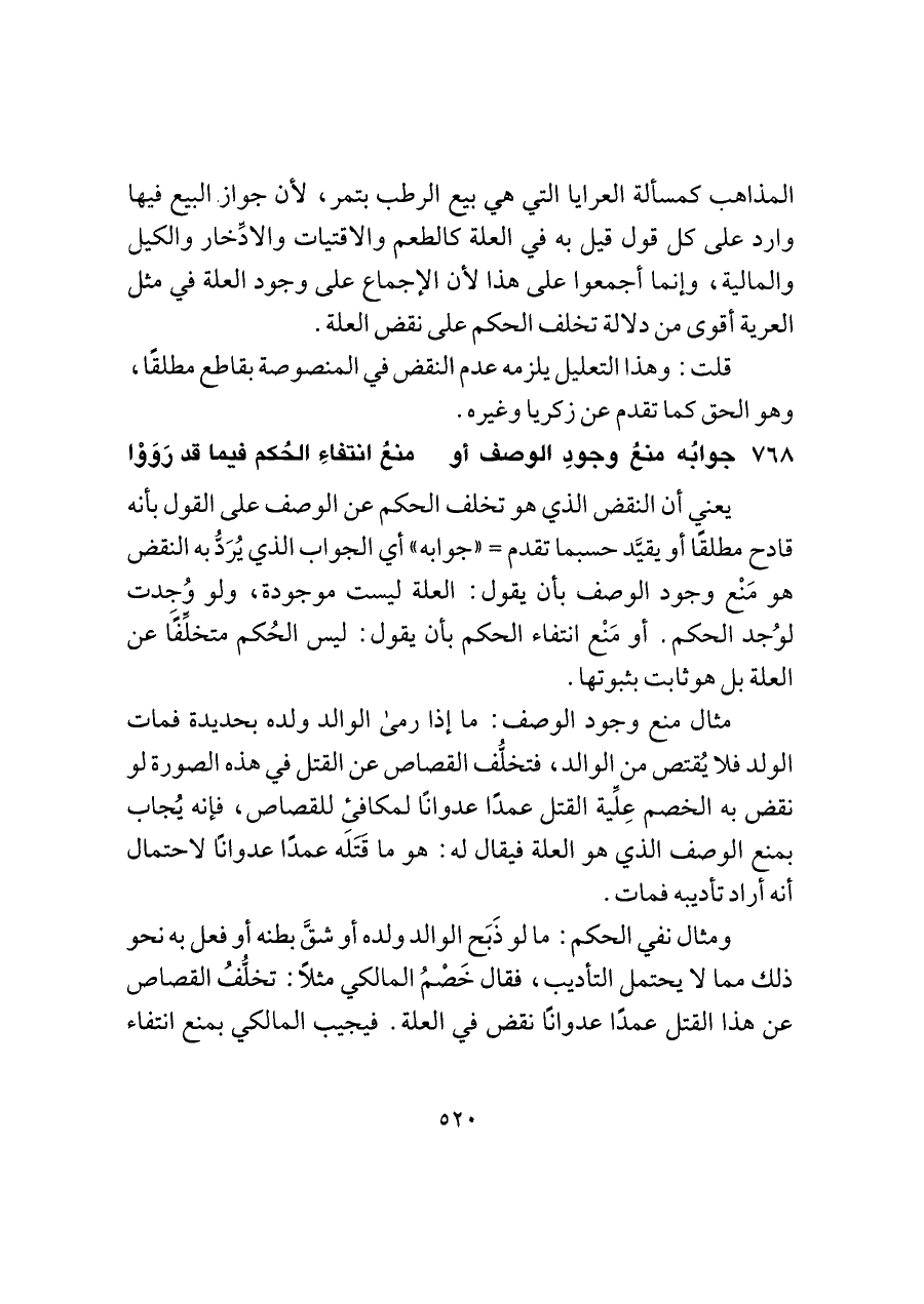 ومثال نفي الحكم: ما لو ذَبَح الوالد ولده أو شقَّ بطنه أو فعل به نحو ذلك مما لا يحتمل التأديب، فقال خَصْمُ المالكي مثلًا: تخلُّفُ القصاص عن هذا القتل عمدًا عدوانًا نقض في العلة. فيجيب المالكي بمنع انتفاء