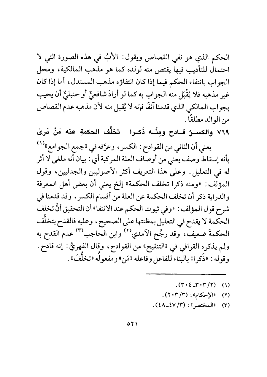 يعني أن الثاني من القوادح: الكسر، وعرَّفه في "جمع الجوامع" (¬١) بأنه إسقاط وصف يعني من أوصاف العلة المركبة أي: بيان أنه ملغى لا أثر له في التعليل. وعلى هذا التعريف أكثر الأصوليين والجدليين، وقول المؤلف: "ومنه ذكرا تخلف الحكمة" إلخ يعني أن بعض أهل المعرفة والدراية ذكر أن تخلف الحكمة عن العلة من أقسام الكسر، وقد قدمنا في شرح قول المؤلف: "وفي ثبوت الحكم عند الانتفا" أن التحقيق أن تخلف الحكمة لا يقدح في التعليل بمظنتها على الصحيح، وعليه فالقدح بتخلُّف الحكمةَ ضعيف، وقد رجَّح الآمدي (¬٢) وابن الحاجب (¬٣) عدم القدح به ولم يذكره القرافي في "التنقيح" من القوادح، وقال الفهريُّ: إنه قادح. وقوله: "ذَكرا" بالبناء للفاعل وفاعله "مَن" ومفعولُه "تخلُّفَ".