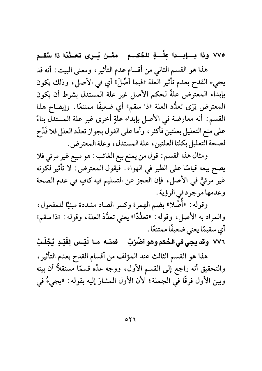 ٧٧٥ - وذا بإبدا عِلَّةٍ للحكم ... ممَّن يَرى تعدُّدًا ذا سُقم