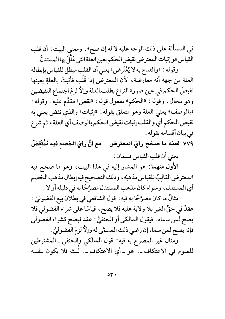 في المسألة على ذلك الوجه عليه لا له إن صح". ومعنى البيت: أن قلب القياس هو إثبات المعترض نقيض الحكم بعين العلة التي عَلَّلَ بها المستدلُّ.