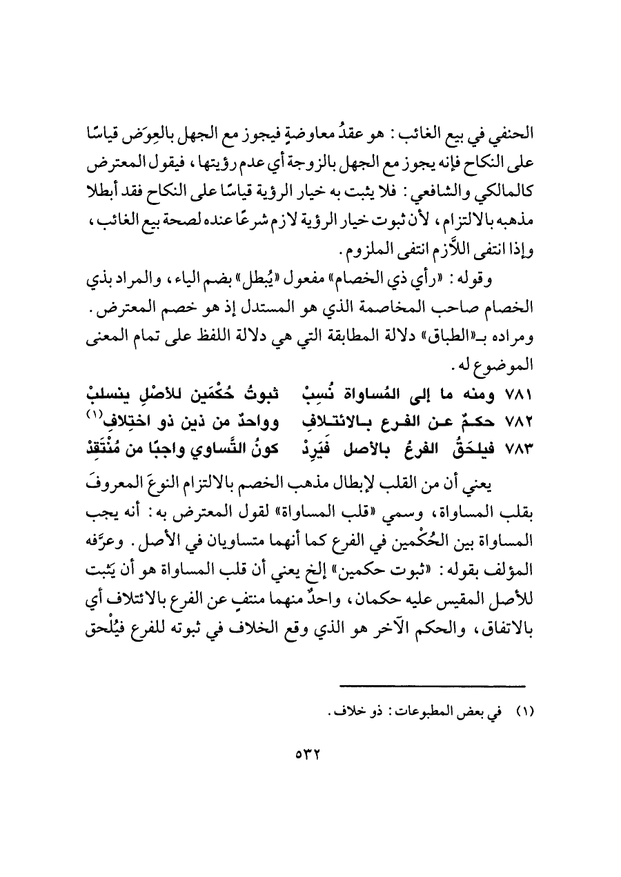 يعني أن من القلب لإبطال مذهب الخصم بالالتزام النوعَ المعروفَ بقلب المساواة، وسمي "قلب المساواة" لقول المعترض به: أنه يجب المساواة بين الحُكْمين في الفرع كما أنهما متساويان في الأصل. وعرَّفه المؤلف بقوله: "ثبوت حكمين" إلخ يعني أن قلب المساواة هو أن يَثبت للأصل المقيس عليه حكمان، واحدٌ منهما منتفٍ عن الفرع بالائتلاف أي بالاتفاق، والحكم الآخر هو الذي وقع الخلاف في ثبوته للفرع فيُلْحق