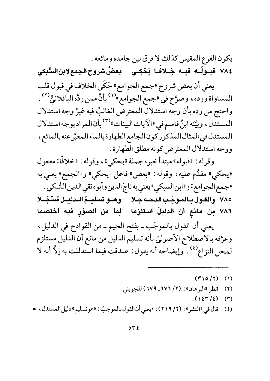 ٧٨٤ - قبوله فيه خِلافًا يَحْكِي ... بعضُ شروح الجمع لابن السُّبكي