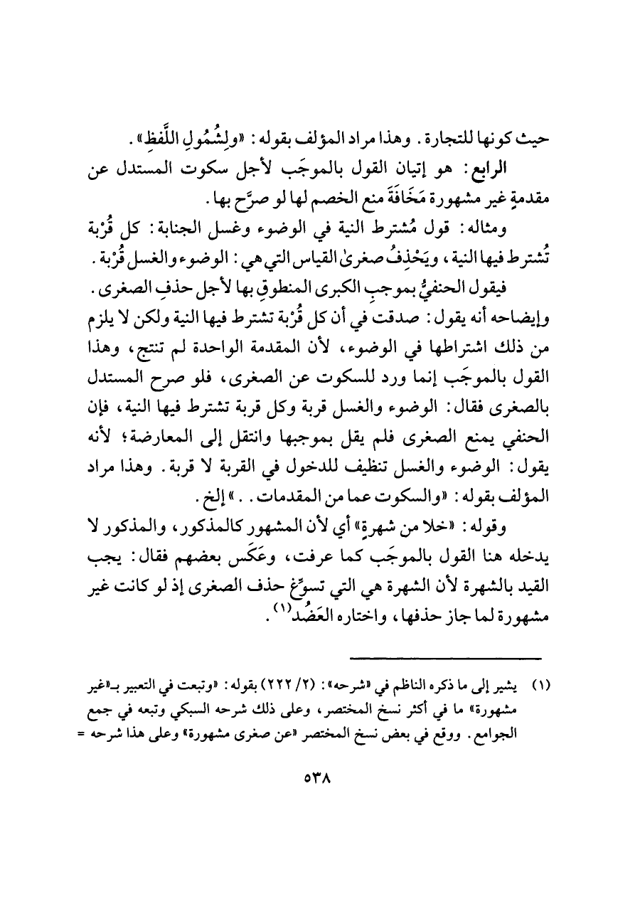 (¬١) يشير إلى ما ذكره الناظم في "شرحه": (٢/ ٢٢٢) بقوله: "وتبعت في التعبير بـ "غير مشهورة" ما في أكثر نسخ المختصر، وعلى ذلك شرحه السبكي وتبعه في جمع الجوامع. ووقع في بعض نسخ المختصر "عن صغرى مشهورة" وعلى هذا شرحه =