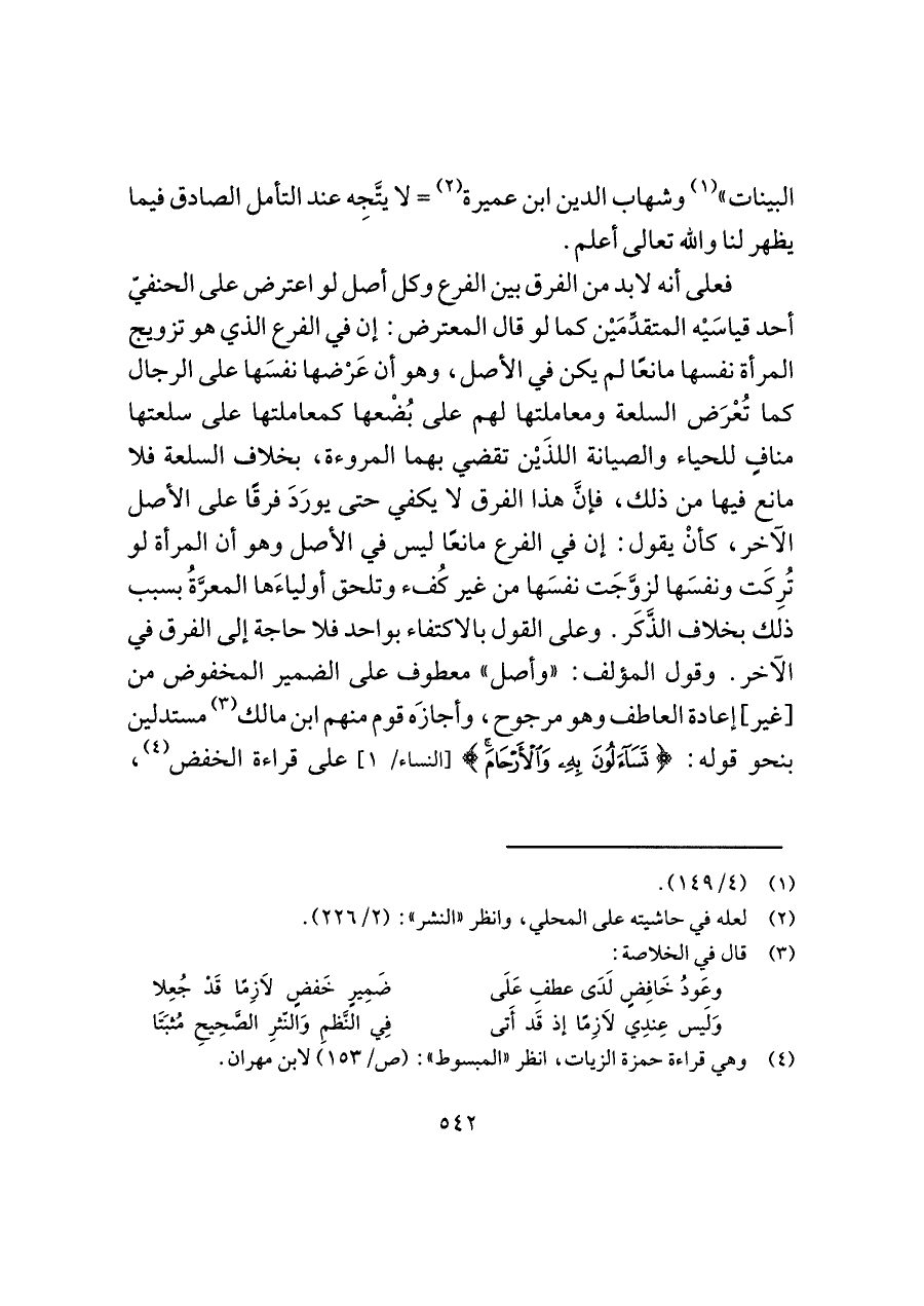 فعلى أنه لابد من الفرق بين الفرع وكل أصل لو اعترض على الحنفيّ أحد قياسَيْه المتقدِّمَيْن كما لو قال المعترض: إن في الفرع الذي هو تزويج المرأة نفسها مانعًا لم يكن في الأصل، وهو أن عَرْضها نفسَها على الرجال كما تُعْرَض السلعة ومعاملتها لهم على بُضْعها كمعاملتها على سلعتها منافٍ للحياء والصيانة اللذَيْن تقضي بهما المروءة، بخلاف السلعة فلا مانع فيها من ذلك، فإنَّ هذا الفرق لا يكفي حتى يورَدَ فرقًا على الأصل الآخر، كأنْ يقول: إن في الفرع مانعًا ليس في الأصل وهو أن المرأة لو تُرِكَت ونفسَها لزوَّجَت نفسَها من غير كُفء وتلحق أولياءَها المعرَّةُ بسبب ذلك بخلاف الذَّكَر. وعلى القول بالاكتفاء بواحد فلا حاجة إلى الفرق في الآخر. وقول المؤلف: "وأصل" معطوف على الضمير المخفوض من [غير] إعادة العاطف وهو مرجوح، وأجازَه قوم منهم ابن مالك (¬٣) مستدلين بنحو قوله: {تَسَاءَلُونَ بِهِ وَالْأَرْحَامَ} [النساء/ ١] على قراءة الخفض (¬٤)،