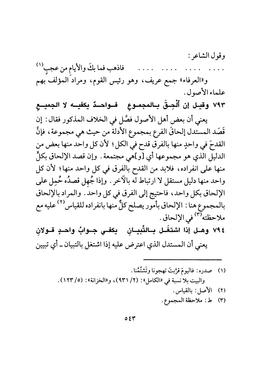 ٧٩٣ - وقيل إن أُلْحِقَ بالمجموعِ ... فواحدٌ يكفيه لا الجميعِ