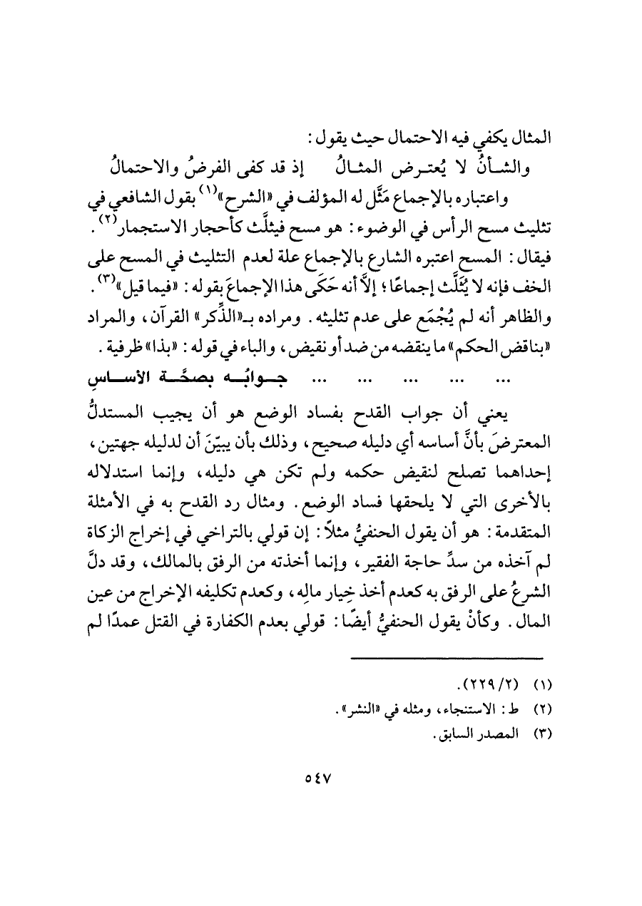 واعتباره بالإجماع مَثَّل له المؤلف في "الشرح" (¬١) بقول الشافعي في تثليث مسح الرأس في الوضوء: هو مسح فيثلَّث كأحجار الاستجمار (¬٢). فيقال: المسح اعتبره الشارع بالإجماع علة لعدم التثليث في المسح على الخف فإنه لا يُثَلَّث إجماعًا؛ إلَّا أنه حَكَى هذا الإجماعَ بقوله: "فيما قيل" (¬٣).
