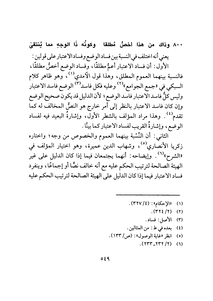 الثاني: أن النِّسْبة بينهما العموم والخصوص من وجه؛ واختاره زكريا الأنصاري (¬٥)، وشهاب الدين عميرة، وهو اختيار المؤلف في "الشرح" (¬٦). وإيضاحه: أنهما يجتمعان فيما إذا كان الدليل على غير الهيئة الصالحة لترتيب الحكم عليه مع أنه خالف نصًّا أو إجماعًا، وينفرد فساد الاعتبار فيما إذا كان الدليل على الهيئة الصالحة لترتيب الحكم عليه