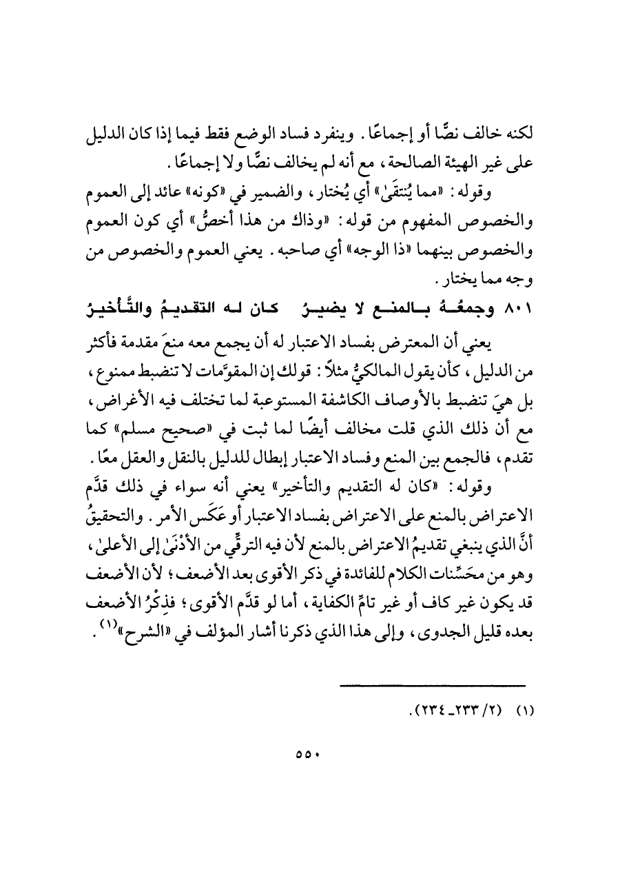 وقوله: "كان له التقديم والتأخير" يعني أنه سواء في ذلك قدَّم الاعتراض بالمنع على الاعتراض بفساد الاعتبار أو عَكَس الأمر. والتحقيقُ أن الذي ينبغي تقديمُ الاعتراض بالمنع لأن فيه الترقِّي من الأدْنَى إلى الأعلى، وهو من محَسِّنات الكلام للفائدة في ذكر الأقوى بعد الأضعف؛ لأن الأضعف قد يكون غير كاف أو غير تامِّ الكفاية، أما لو قدَّم الأقوى؛ فذِكْرُ الأضعف بعده قليل الجدوى، وإلى هذا الذي ذكرنا أشار المؤلف في "الشرح" (¬١).