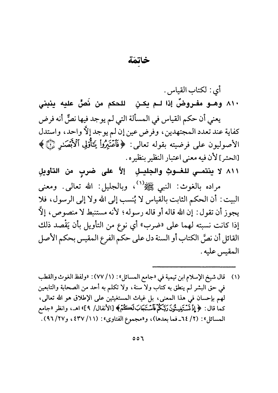 مراده بالغوث: النبي -صلى اللَّه عليه وسلم- (¬١)، وبالجليل: اللَّه تعالى. ومعنى البيت: أن الحكم الثابت بالقياس لا يُنسب إلى اللَّه ولا إلى الرسول، فلا يجوز أن تقول: إن اللَّه قاله أو قاله رسوله؛ لأنه مستنبط لا منصوص، إلَّا إذا كانت نسبته لهما على "ضرب" أي نوع من التأويل بأن يَقْصد ذلك القائل أن نصَّ الكتاب أو السنة دل على حكم الفرع المقيس بحكم الأصل المقيس عليه