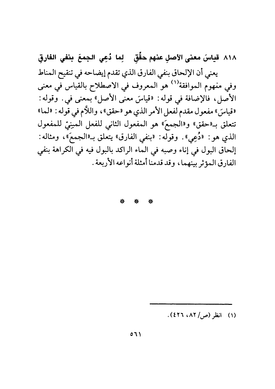 ٨١٨ - قياسَ معنى الأصلِ عنهم حقِّقِ ... لِما دُعِي الجمعَ بنفي الفارقِ
