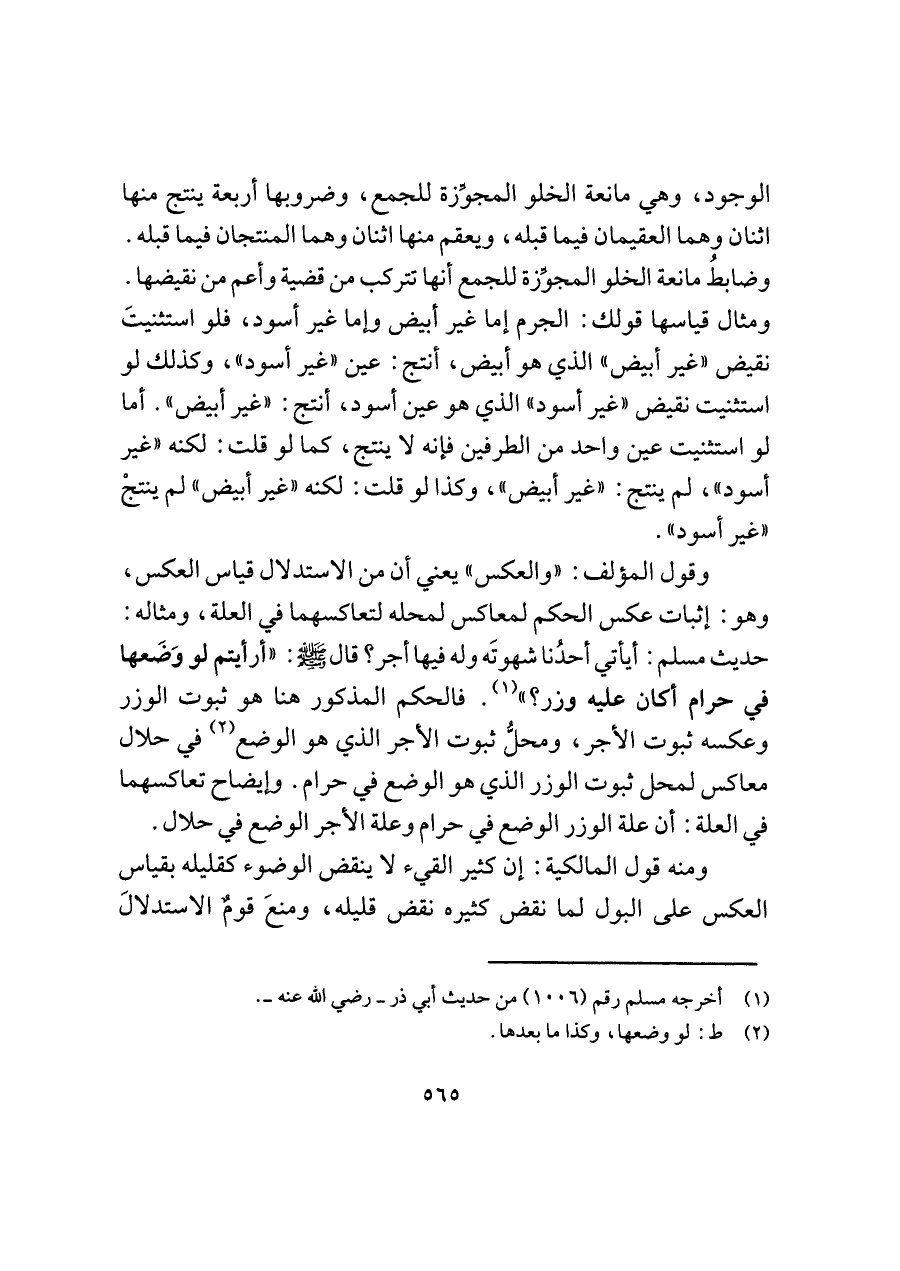 وقول المؤلف: "والعكس" يعني أن من الاستدلال قياس العكس، وهو: إثبات عكس الحكم لمعاكس لمحله لتعاكسهما في العلة، ومثاله: حديث مسلم: أيأتي أحدُنا شهوتَه وله فيها أجر؟ قال -صلى اللَّه عليه وسلم-: "أرأيتم لو وَضَعها في حرام أكان عليه وزر؟ " (¬١). فالحكم المذكور هنا هو ثبوت الوزر وعكسه ثبوت الأجر، ومحلُّ ثبوت الأجر الذي هو الوضع (¬٢) في حلال معاكس لمحل ثبوت الوزر الذي هو الوضع في حرام. وإيضاح تعاكسهما في العلة: أن علة الوزر الوضع في حرام وعلة الأجر الوضع في حلال.