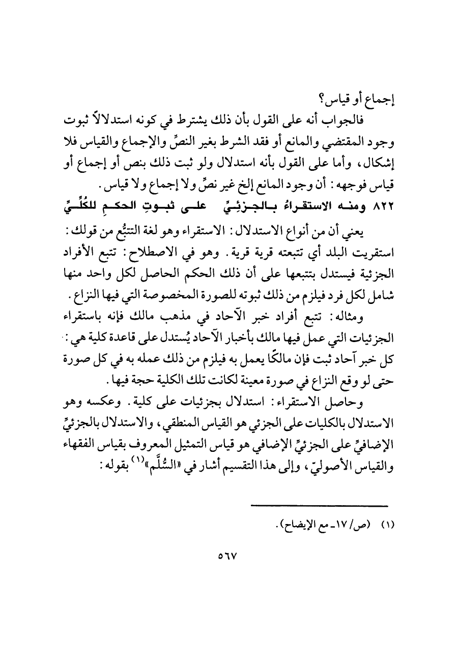 ٨٢٢ - ومنه الاستقراء بالجزئِيِّ ... على ثبوتِ الحكمِ للكُلِّيِّ