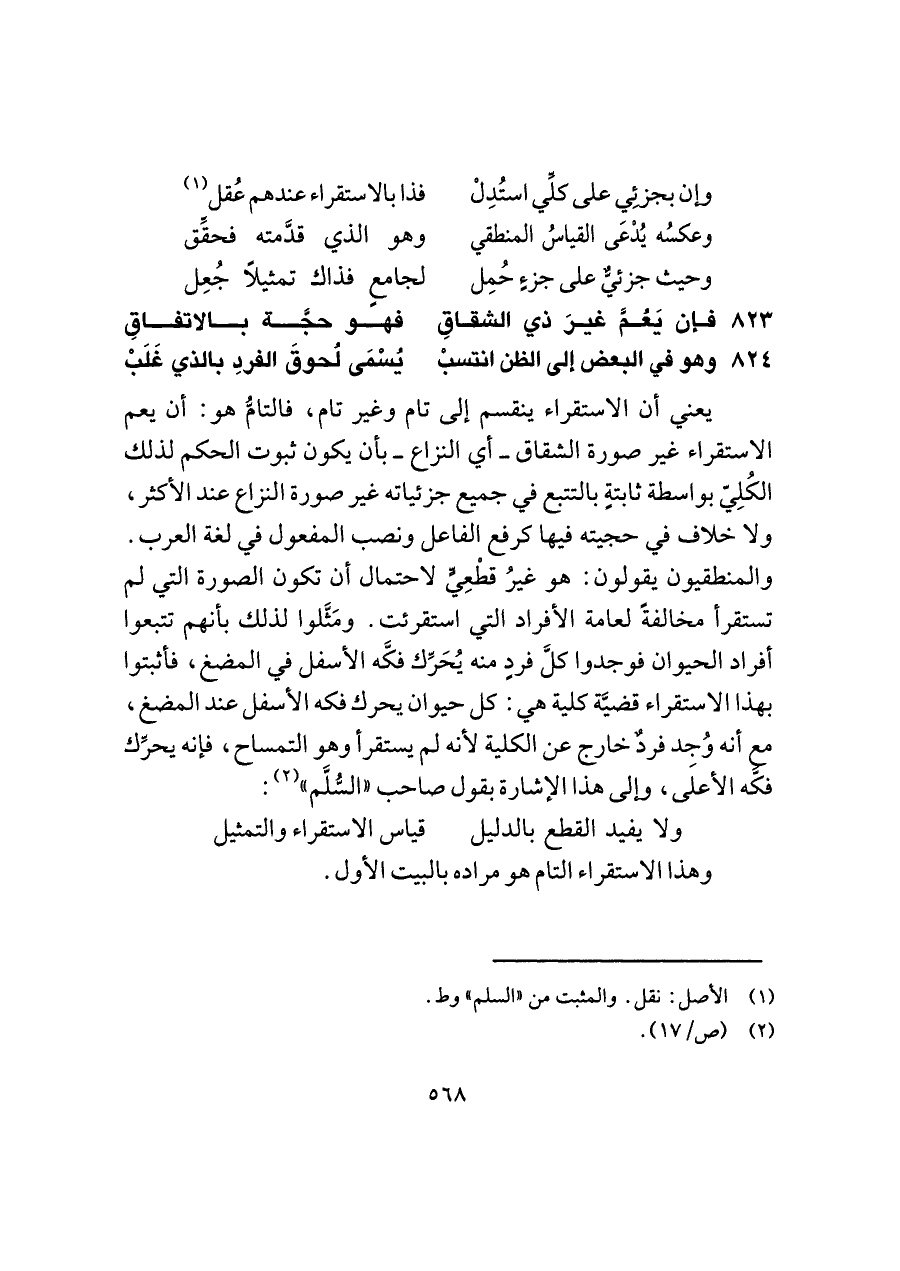 يعني أن الاستقراء ينقسم إلى تام وغير تام، فالتامُّ هو: أن يعم الاستقراء غير صورة الشقاق -أي النزاع- بأن يكون ثبوت الحكم لذلك الكُلِيّ بواسطة ثابتةٍ بالتتبع في جميع جزئياته غير صورة النزاع عند الأكثر، ولا خلاف في حجيته فيها كرفع الفاعل ونصب المفعول في لغة العرب. والمنطقيون يقولون: هو غيرُ قطْعِيٍّ لاحتمال أن تكون الصورة التي لم تستقرأ مخالفةً لعامة الأفراد التي استقرئت. ومَثَّلوا لذلك بأنهم تتبعوا أفراد الحيوان فوجدوا كلَّ فردٍ منه يُحَرِّك فكَّه الأسفل في المضغ، فأثبتوا بهذا الاستقراء قضيَّة كلية هي: كل حيوان يحرك فكه الأسفل عند المضغ، مع أنه وُجِد فردٌ خارج عن الكلية لأنه لم يستقرأ وهو التمساح، فإنه يحرِّك فكَّه الأعلى، وإلى هذا الإشارة بقول صاحب "السُّلَّم" (¬٢):