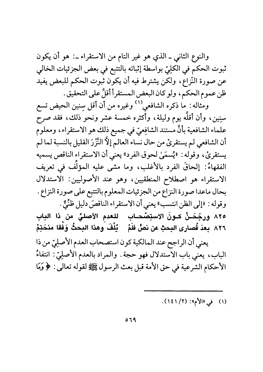 ومثاله: ما ذكره الشافعي (¬١) وغيره من أن أقل سِنين الحيض تسع سنِين، وأن أقلَّه يوم وليلة، وأكثره خمسة عشر ونحو ذلك، فقد صرح علماء الشافعية بأنَّ مستند الشافِعيّ في جميع ذلك هو الاستقراء، ومعلوم أن الشافعي لم يستقرئ من حال نساء العالم إلَّا النَّزْرَ القليل بالنسبة لما لم يستقرئ، وقوله: "يُسمَى لحوق الفرد" يعني أن الاستقراء الناقص يسميه الفقهاءُ: إلحاقَ الفرد بالأغلب، وما مشى عليه المؤلِّف في تعريف الاستقراء هو اصطلاح المنطقيين، وهو عند الأصوليين: الاستدلال بحال ما عدا صورة النزاع من الجزئيات المعلوم بالتتبع على صورة النزاع. وقوله: "إلى الظن انتسب" يعني أن الاستقراء الناقصَ دليل ظنِّيٌّ.