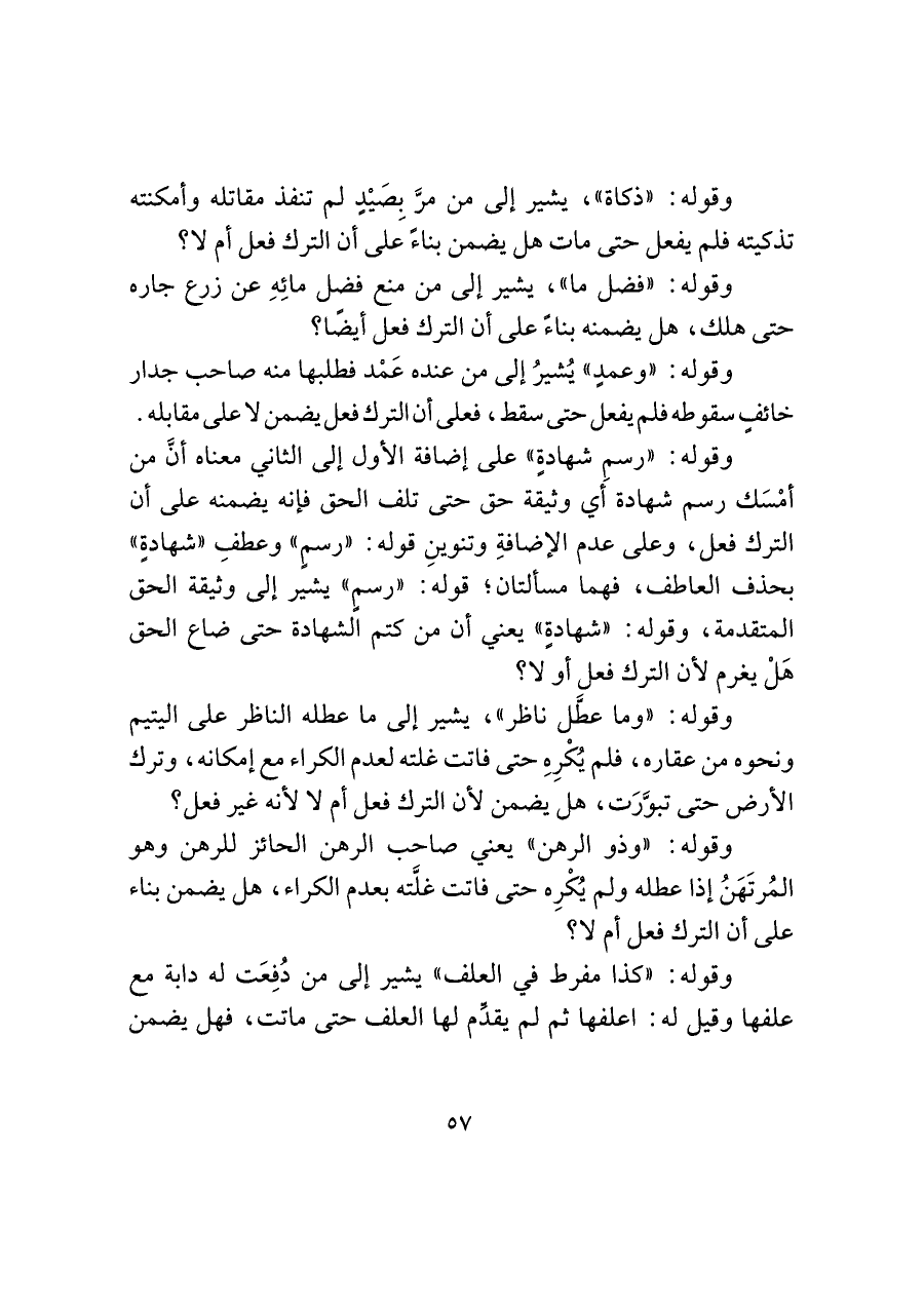 وقوله: "رسمِ شهادةٍ" على إضافة الأول إلى الثاني معناه أن من أمْسَك رسم شهادة أي وثيقة حق حتى تلف الحق فإنه يضمنه على أن الترك فعل، وعلى عدم الإضافةِ وتنوينِ قوله: "رسمٍ" وعطفِ "شهادةٍ" بحذف العاطف، فهما مسألتان؛ قوله: "رسمٍ" يشير إلى وثيقة الحق المتقدمة، وقوله: "شهادةٍ" يعني أن من كتم الشهادة حتى ضاع الحق هَلْ يغرم لأن الترك فعل أو لا؟
