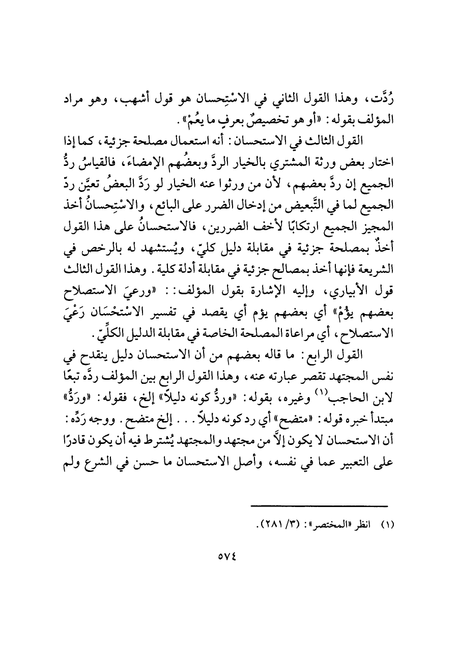 القول الثالث في الاستحسان: أنه استعمال مصلحة جزئية، كما إذا اختار بعض ورثة المشتري بالخيار الردَّ وبعضُهم الإمضاءَ، فالقياسُ ردُّ الجميع إن ردَّ بعضهم، لأن من ورثوا عنه الخيار لو رَدَّ البعضُ تعيَّن ردّ الجميع لما في التَّبعيض من إدخال الضرر على البائع، والاسْتِحسانُ أخذ المجيز الجميع ارتكابًا لأخف الضررين، فالاستحسانُ على هذا القول أخذٌ بمصلحة جزئية في مقابلة دليل كليّ، ويُستشهد له بالرخص في الشريعة فإنها أخذ بمصالح جزئية في مقابلة أدلة كلية. وهذا القول الثالث قول الأبياري، وإليه الإشارة بقول المؤلف: "ورعيَ الاستصلاح بعضهم يؤُمْ" أي بعضهم يؤم أي يقصد في تفسير الاسْتحْسَان رَعْيَ الاستصلاح، أي مراعاة المصلحة الخاصة في مقابلة الدليل الكلِّيّ.