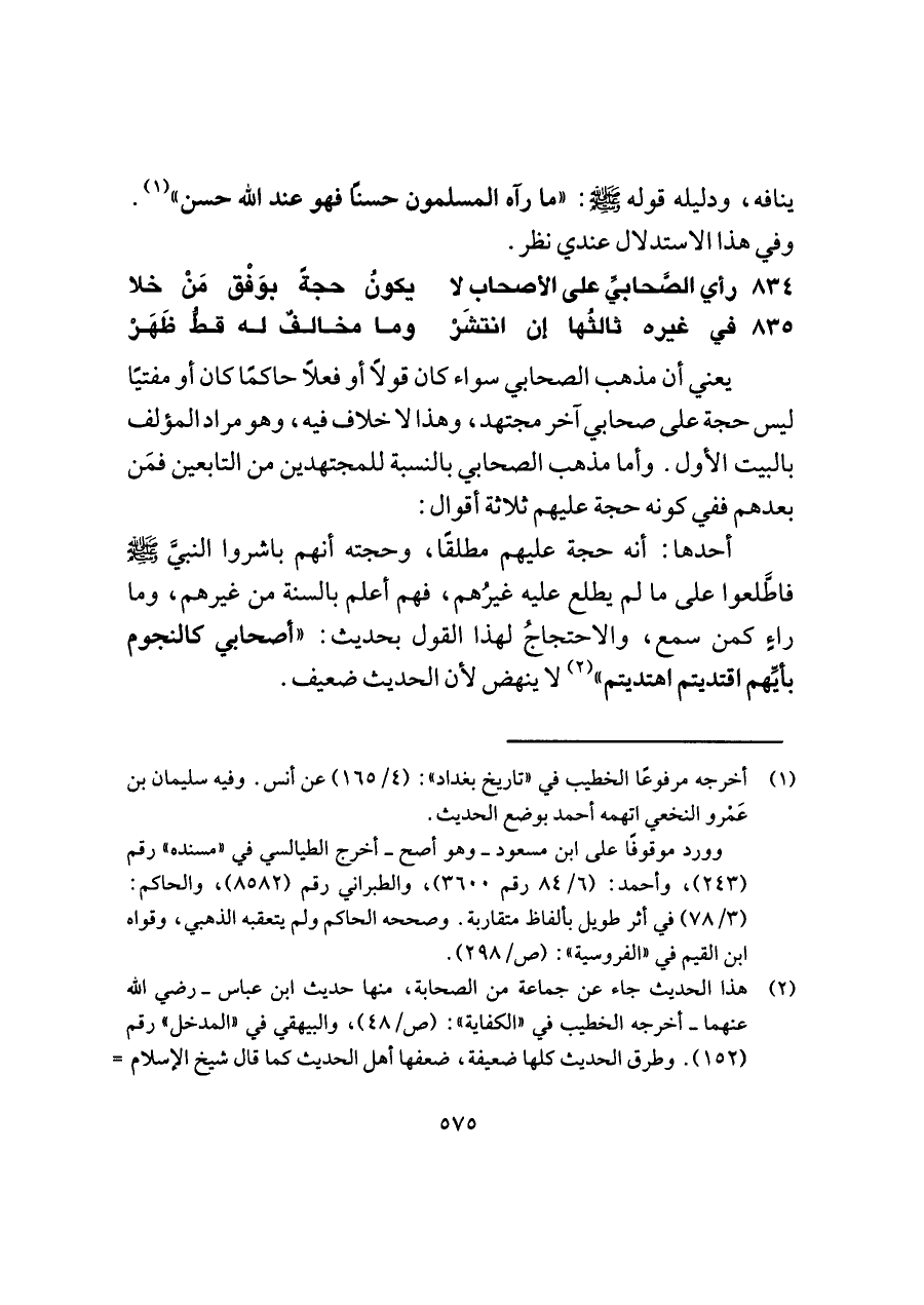 ٨٣٤ - رأي الصَّحابيِّ على الأصحاب لا ... يكونُ حجةً بوَفْق مَنْ خلا