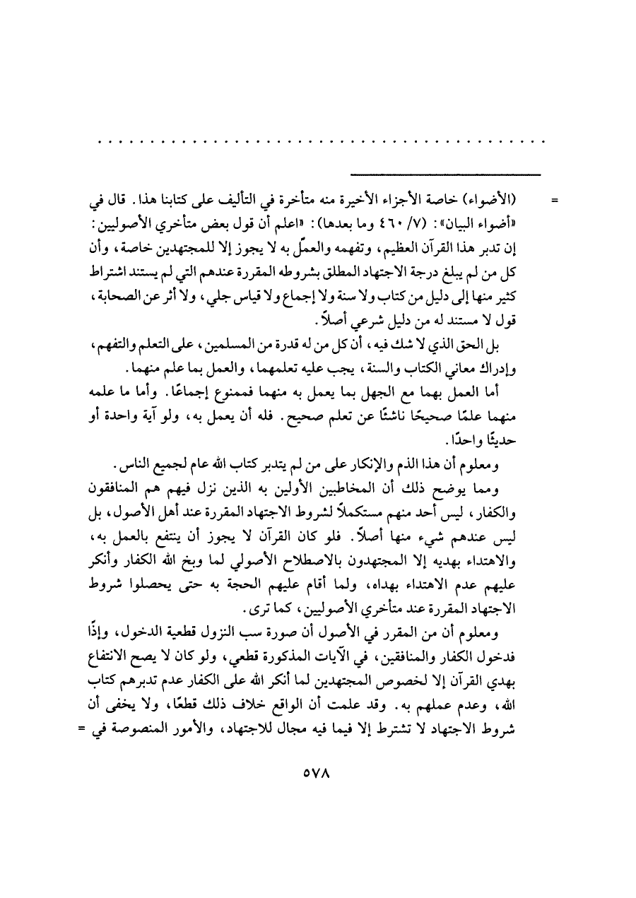 = (الأضواء) خاصة الأجزاء الأخيرة منه متأخرة في التأليف على كتابنا هذا. قال في "أضواء البيان": (٧/ ٤٦٠ وما بعدها): "اعلم أن قول بعض متأخري الأصوليين: إن تدبر هذا القرآن العظيم، وتفهمه والعمل به لا يجوز إلا للمجتهدين خاصة، وأن كل من لم يبلغ درجة الاجتهاد المطلق بشروطه المقررة عندهم التي لم يستند اشتراط كثير منها إلى دليل من كتاب ولا سنة ولا إجماع ولا قياس جلي، ولا أثر عن الصحابة، قول لا مستند له من دليل شرعي أصلًا.