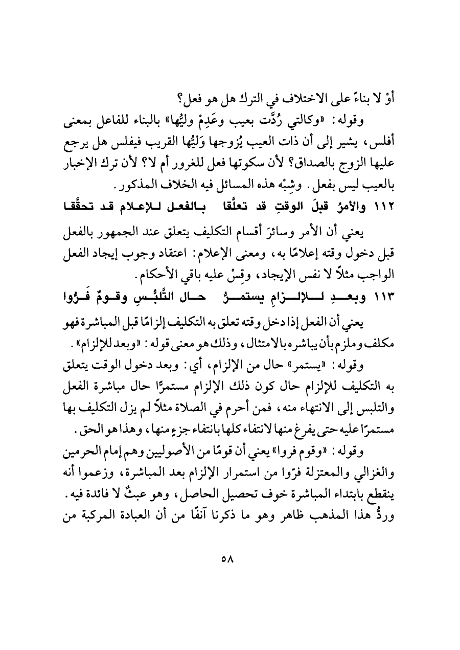 وقوله: "وقوم فروا" يعني أن قومًا من الأصوليين وهم إمام الحرمين والغزالي والمعتزلة فرّوا من استمرار الإلزام بعد المباشرة، وزعموا أنَّه ينقطع بابتداء المباشرة خوف تحصيل الحاصل، وهو عبثٌ لا فائدة فيه. وردُّ هذا المذهب ضاهر وهو ما ذكرنا آنفًا من أن العبادة المركبة من