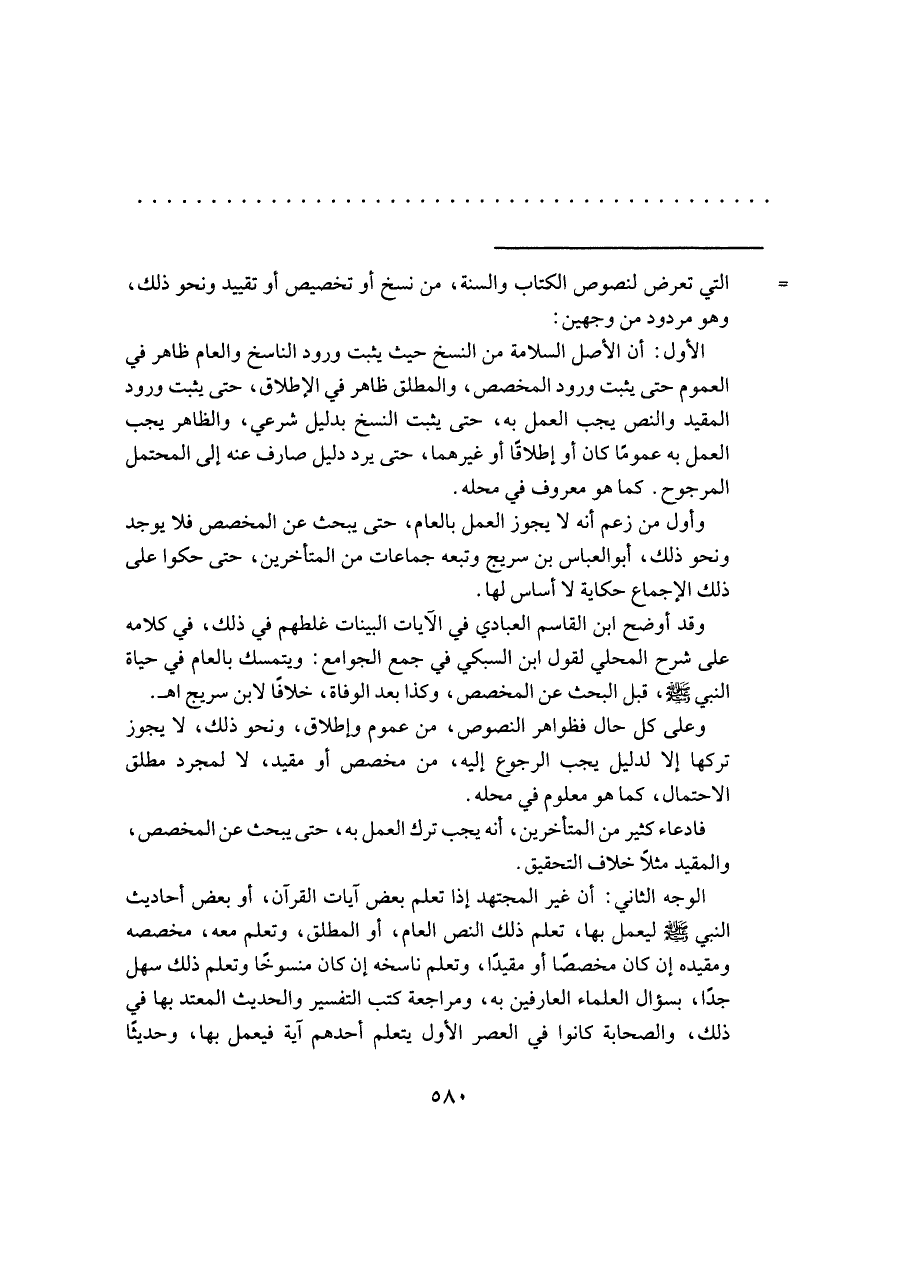 وقد أوضح ابن القاسم العبادي في الآيات البينات غلطهم في ذلك، في كلامه على شرح المحلي لقول ابن السبكي في جمع الجوامع: ويتمسك بالعام في حياة النبي -صلى اللَّه عليه وسلم-، قبل البحث عن المخصص، وكذا بعد الوفاة، خلافًا لابن سريج اهـ.