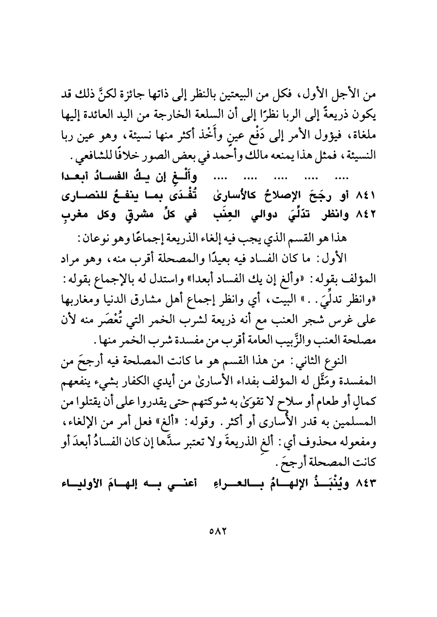 النوع الثاني: من هذا القسم هو ما كانت المصلحة فيه أرجحَ من المفسدة ومَثَّل له المؤلف بفداء الأسارى من أيدي الكفار بشيء ينفعهم كمالٍ أو طعام أو سلاح لا تقوَى به شوكتهم حتى يقدروا على أن يقتلوا من المسلمين به قدر الأُسارى أو أكثر. وقوله: "ألغ" فعل أمر من الإلغاء، ومفعوله محذوف أي: ألغِ الذريعةَ ولا تعتبر سدَّها إن كان الفسادُ أبعدَ أو كانت المصحلة أرجحَ.