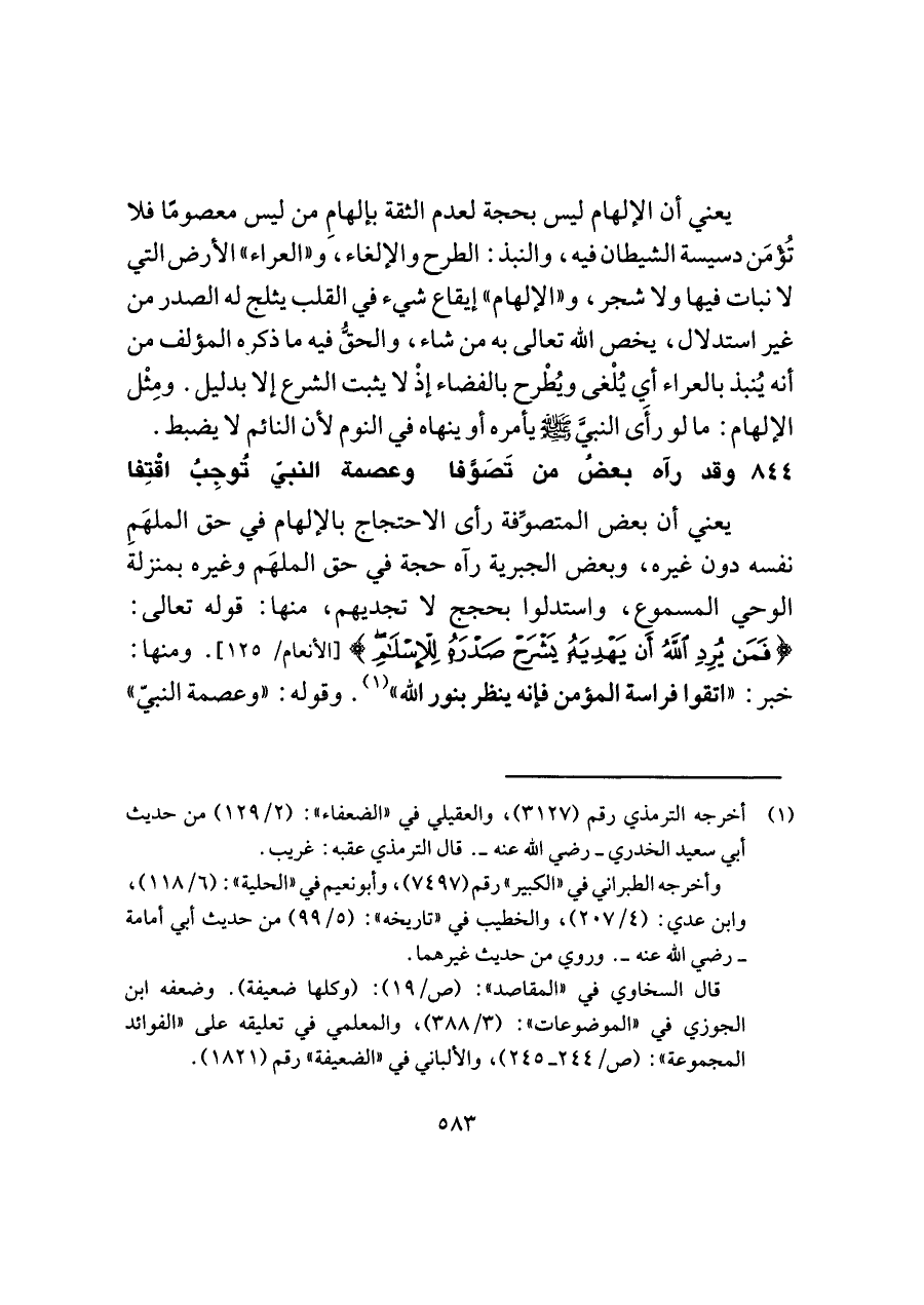 يعني أن بعض المتصوِّفة رأى الاحتجاج بالإلهام في حق الملهَمِ نفسه دون غيره، وبعض الجبرية رآه حجة في حق الملهَم وغيره بمنزلة الوحي المسموع، واستدلوا بحجج لا تجديهم، منها: قوله تعالى: {فَمَنْ يُرِدِ اللَّهُ أَنْ يَهدِيَهُ يَشْرَحْ صَدْرَهُ لِلْإِسْلَامِ} [الأنعام/ ١٢٥]. ومنها: خبر: "اتقوا فراسة المؤمن فإنه ينظر بنور اللَّه" (¬١). وقوله: "وعصمة النبيّ"