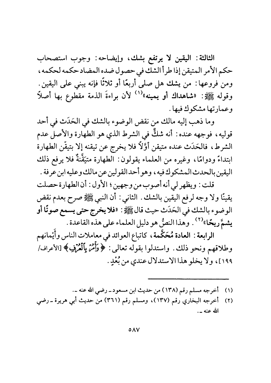 قلت: ويظهر لي أنه أصوب من وجهين؛ الأول: أن الطهارة حصلت يقينًا ولا وجه لرفع اليقين بالشك. الثاني: أن النبي -صلى اللَّه عليه وسلم- صرح بعدم نقض الوضوء بالشك في الحَدَث حيث قال -صلى اللَّه عليه وسلم-: "فلا يخرج حتى يسمع صوتًا أو يشمَّ ريحًا" (¬٢). وهذا النصُّ هو دليل العلماء على هذه القاعدة.