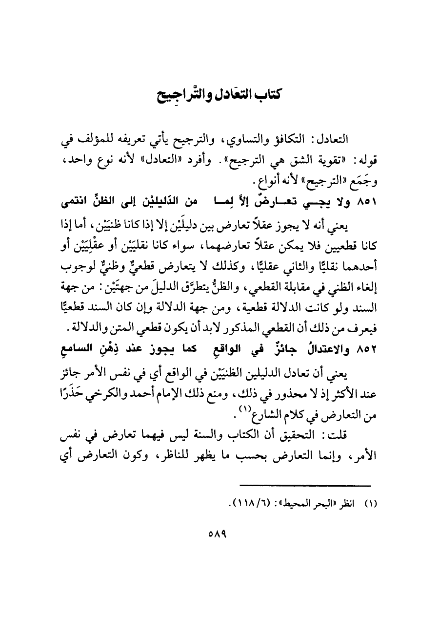 التعادل: التكافؤ والتساوي، والترجيح يأتي تعريفه للمؤلف في قوله: "تقوية الشق هي الترجيح". وأفرد "التعادل" لأنه نوع واحد، وجَمَع "الترجيح" لأنه أنواع.