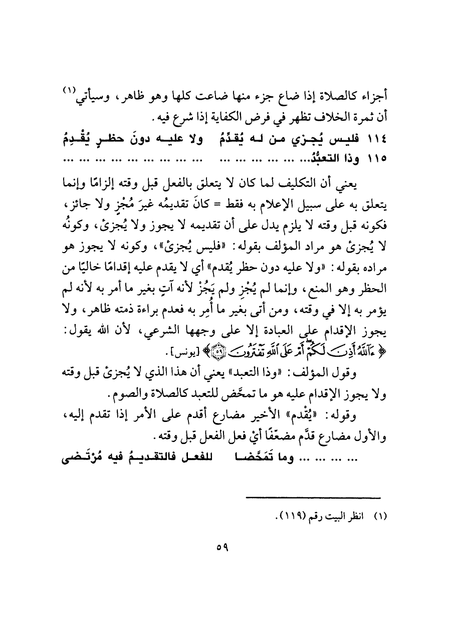 يعني أن التكليف لما كان لا يتعلق بالفعل قبل وقته إلزامًا وإنَّما يتعلق به على سبيل الإعلام به فقط = كانَ تقديمُه غيرَ مُجْزٍ ولا جائز، فكونه قبل وقته لا يلزم يدل على أن تقديمه لا يجوز ولا يُجزئ، وكونُه لا يُجزئ هو مراد المؤلف بقوله: "فليس يُجزئ"، وكونه لا يجوز هو مراده بقوله: "ولا عليه دون حظر يُقدم" أي لا يقدم عليه إقدامًا خاليًا من الحظر وهو المنع، وإنما لم يُجْزِ ولم يَجُزْ لأنه آتٍ بغير ما أمر به لأنه لم يؤمر به إلَّا في وقته، ومن أتى بغير ما أُمِر به فعدم براءة ذمته ظاهر، ولا يجوز الإقدام على العبادة إلَّا على وجهها الشرعي، لأن اللَّه يقول: {آللَّهُ أَذِنَ لَكُمْ أَمْ عَلَى اللَّهِ تَفْتَرُونَ (٥٩)} [يونس].