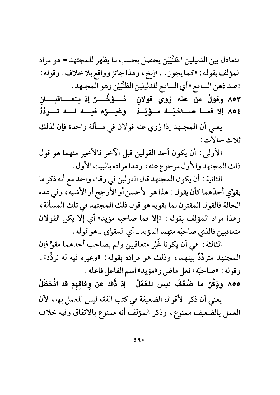 الثانية: أن يكون المجتهد قال القولين في وقت واحد مع أنه ذكر ما يقوِّي أحدَهما كأن يقول: هذا هو الأحسن أو الأرجح أو الأشبه، وفي هذه الحالة فالقول المقترن بما يقويه هو قول ذلك المجتهد في تلك المسألة، وهذا مراد المؤلف بقوله: "إلا فما صاحبه مؤيد" أي إلا يكن القولان متعاقبين فالذي صاحبَه منهما المؤيد -أي المقوَّى- هو قوله.