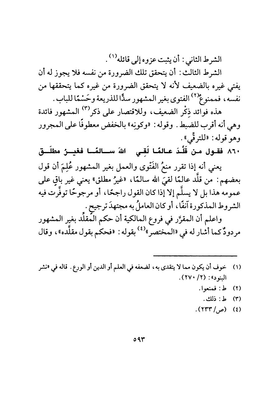 ٨٦٠ - فقول من قَلَّدَ عالمًا لَقِي ... اللَّهَ سالمًا فغيرُ مطلَق