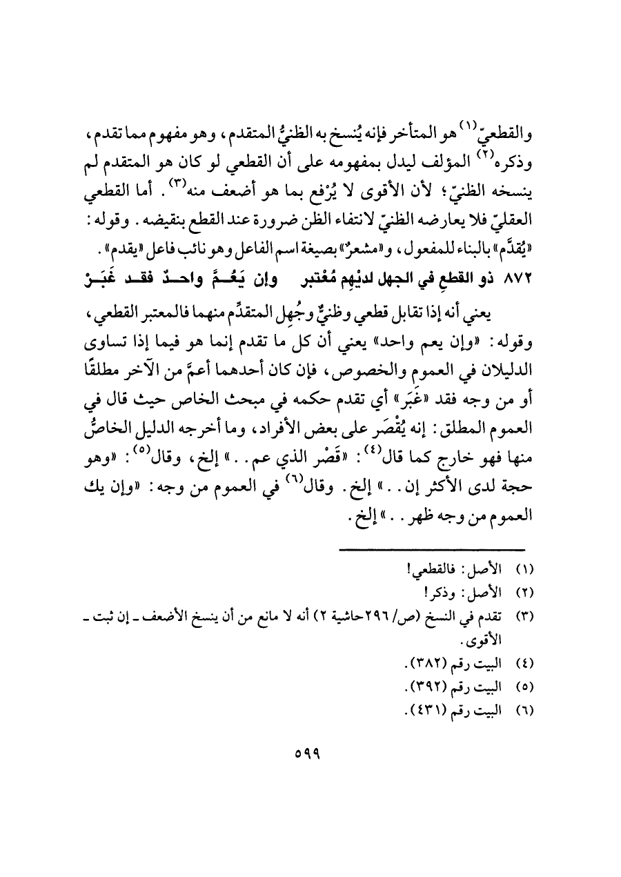 يعني أنه إذا تقابل قطعي وظنيٌّ وجُهِل المتقدِّم منهما فالمعتبر القطعي، وقوله: "وإن يعم واحد" يعني أن كل ما تقدم إنما هو فيما إذا تساوى الدليلان في العمومِ والخصوص، فإن كان أحدهما أعمَّ من الآخر مطلقًا أو من وجه فقد "غَبَر" أي تقدم حكمه في مبحث الخاص حيث قال في العموم المطلق: إنه يُقْصَر على بعض الأفراد، وما أخرجه الدليل الخاصُّ منها فهو خارج كما قال (¬٤): "قَصْر الذي عم. . " إلخ، وقال (¬٥): "وهو حجة لدى الأكثر إن. . " إلخ. وقال (¬٦) في العموم من وجه: "وإن يك العموم من وجه ظهر. . " إلخ.