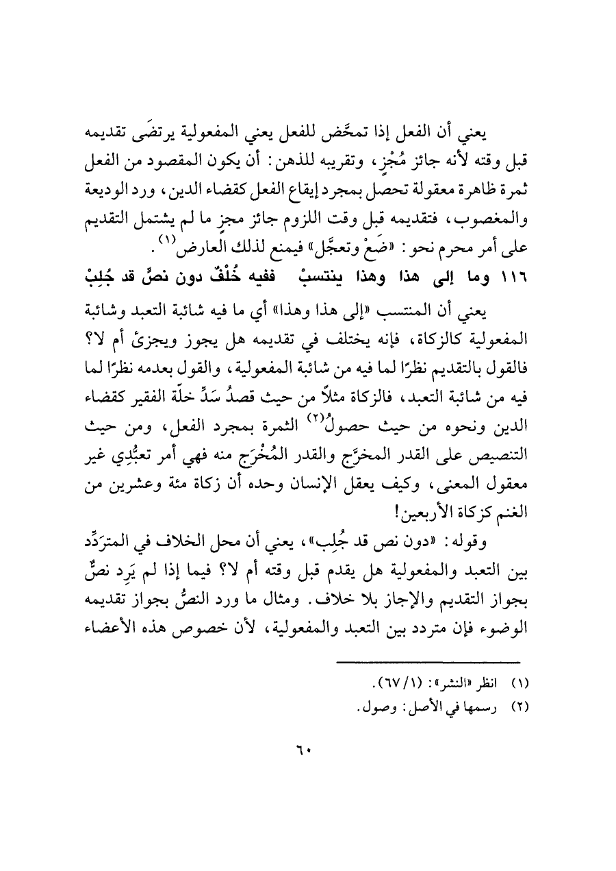 يعني أن المنتسب "إلى هذا وهذا" أي ما فيه شائبة التعبد وشائبة المفعولية كالزكاة، فإنه يختلف في تقديمه هل يجوز ويجزئ أم لا؟ فالقول بالتقديم نظرًا لما فيه من شائبة المفعولية، والقول بعدمه نظرًا لما فيه من شائبة التعبد، فالزكاة مثلًا من حيث قصدُ سَدِّ خلّة الفقير كقضاء الدين ونحوه من حيث حصولُ (¬٢) الثمرة بمجرد الفعل، ومن حيث التنصيص على القدر المخرَّج والقدر المُخْرَج منه فهي أمر تعبُّدِي غير معقول المعنى، وكيف يعقل الإنسان وحده أن زكاة مئة وعشرين من الغنم كزكاة الأربعين!