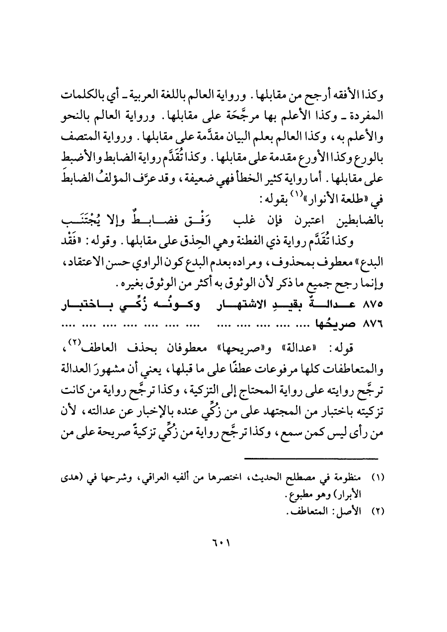 وكذا الأفقه أرجح من مقابلها. ورواية العالم باللغة العربية -أي بالكلمات المفردة- وكذا الأعلم بها مرجَّحَة على مقابلها. ورواية العالم بالنحو والأعلم به، وكذا العالم بعلم البيان مقدَّمة على مقابلها. ورواية المتصف بالورع وكذا الأورع مقدمة على مقابلها. وكذا تُقَدَّم رواية الضابط والأضبط على مقابلها. أما رواية كثير الخطأ فهي ضعيفة، وقد عرَّف المؤلفُ الضابطَ في "طلعة الأنوار" (¬١) بقوله: