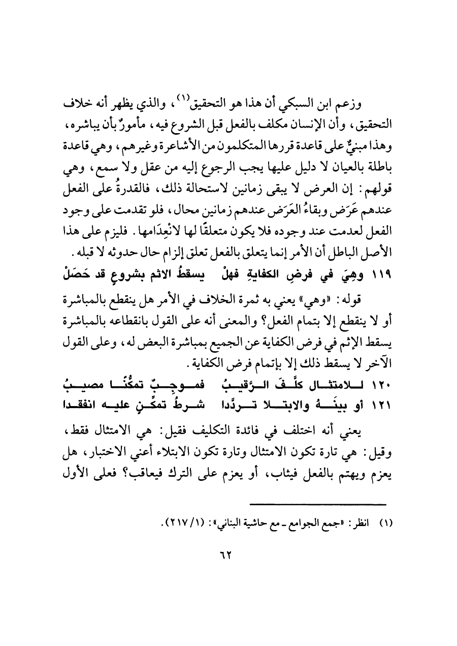 وزعم ابن السبكي أن هذا هو التحقيق (¬١)، والذي يظهر أنَّه خلاف التحقيق، وأن الإنسان مكلف بالفعل قبل الشروع فيه، مأمورٌ بأن يباشره، وهذا مبنيٌّ على قاعدة قررها المتكلمون من الأشاعرة وغيرهم، وهي قاعدة باطلة بالعيان لا دليل عليها يجب الرجوع إليه من عقل ولا سمع، وهي قولهم: إن العرض لا يبقى زمانين لاستحالة ذلك، فالقدرةُ على الفعل عندهم عَرَض وبقاءُ العَرَض عندهم زمانين محال، فلو تقدمت على وجود الفعل لعدمت عند وجوده فلا يكون متعلقًا لها لانْعِدَامها. فليزم على هذا الأصل الباطل أن الأمر إنما يتعلق بالفعل تعلق إلزام حال حدوثه لا قبله.