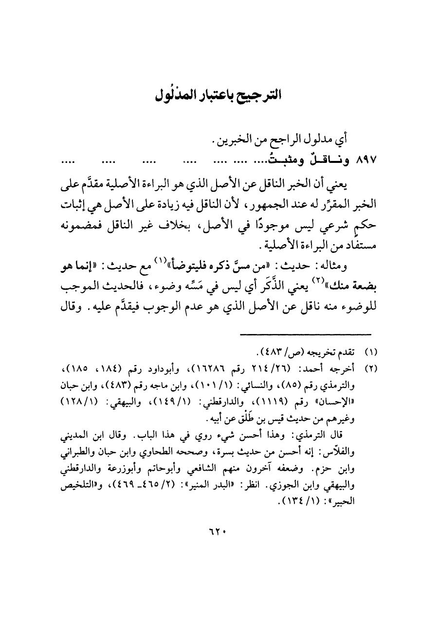 ومثاله: حديث: "من مسَّ ذكره فليتوضأ" (¬١) مع حديث: "إنما هو بضعة منك" (¬٢) يعني الذَّكَر أي ليس في مَسِّه وضوء، فالحديث الموجب للوضوء منه ناقل عن الأصل الذي هو عدم الوجوب فيقدَّم عليه. وقال