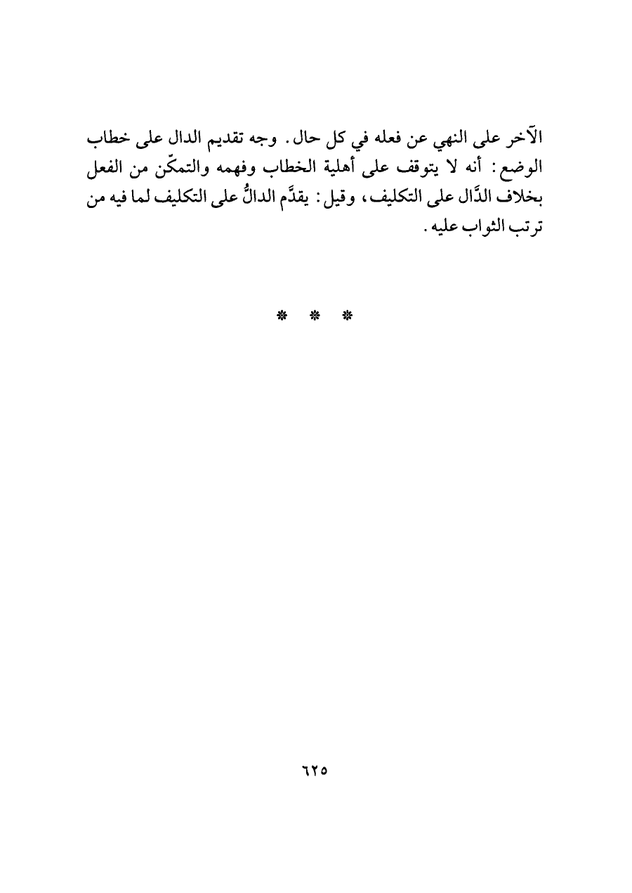 الآخر على النهي عن فعله في كل حال. وجه تقديم الدال على خطاب الوضع: أنه لا يتوقف على أهلية الخطاب وفهمه والتمكّن من الفعل بخلاف الدَّال على التكليف، وقيل: يقدَّم الدالُّ على التكليف لما فيه من ترتب الثواب عليه.
