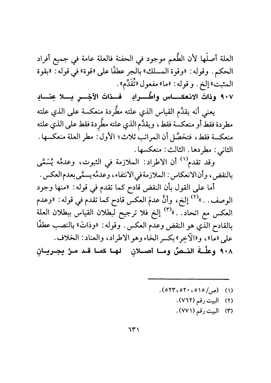 ٩٠٨ - وعلَّةَ النصِّ وما أصلانِ ... لها كما قد مرَّ يجريانِ