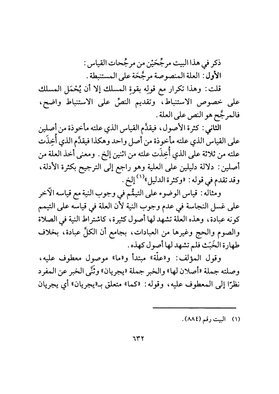 الثاني: كثرة الأصول، فيقدَّم القياس الذي علته مأخوذة من أصلين على القياس الذي علته مأخوذة من أصل واحد وهكذا فيقدَّم الذي أُخِذَت علته من ثلاثة على الذي أُخِذَت علته من اثنين إلخ. ومعنى أخذ العلة من أصلين: دلالة دليلين على العلية وهو راجع إلى الترجيح بكثرة الأدلة، وقد تقدم في قوله: "وكثرة الدليل" (¬١) إلخ.