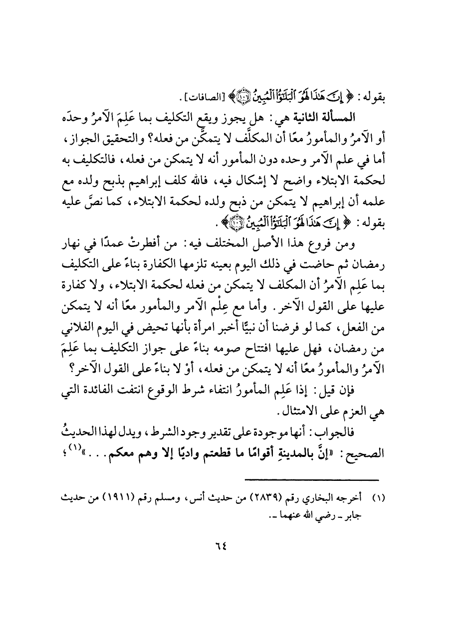 المسألة الثانية هي: هل يجوز ويقع التكليف بما عَلِمَ الآمرُ وحدَه أو الآمرُ والمأكورُ معًا أن المكلَّف لا يتمكَّن من فعله؟ والتحقيق الجواز، أما في علم الآمر وحده دون المأمور أنَّه لا يتمكن من فعله، فالتكليف به لحكمة الابتلاء واضح لا إشكال فيه، فاللَّه كلف إبراهيم بذبح ولده مع علمه أن إبراهيم لا يتمكن من ذبح ولده لحكمة الابتلاء، كما نصَّ عليه بقوله: {إِنَّ هَذَا لَهُوَ الْبَلَاءُ الْمُبِينُ (١٠٦)}.