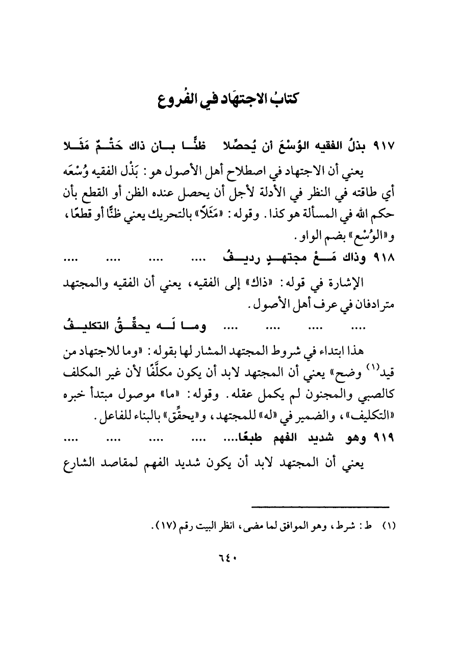 ٩١٧ - بذلُ الفقيه الوُسْعَ أن يُحصِّلا ... ظنًّا بأن ذاك حَتْمٌ مَثَلا