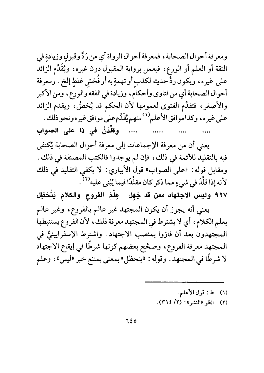 يعني أن من معرفة الإجماعات إلى معرفة أحوال الصحابة يُكتفى فيه بالتقليد للأئمة في ذلك، فإن لم يوجدوا فالكتب المصنفة في ذلك. ومقابل قوله: "على الصواب" قول الأبياري: لا يكفي التقليد في ذلك لأنه إذا قلَّدَ في شيءٍ مما ذكر كان مقلِّدًا فيما يُبْنى عليه (¬٢).