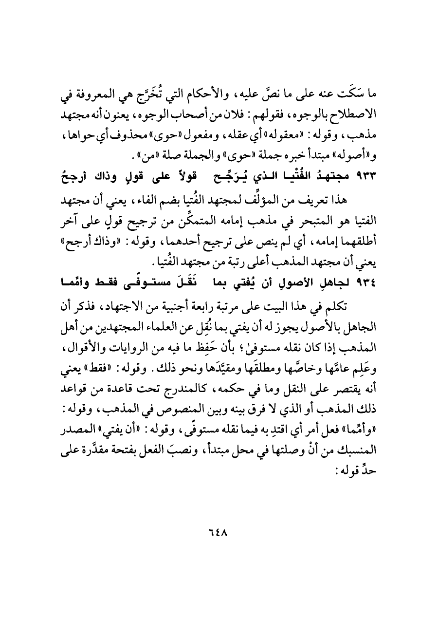 تكلم في هذا البيت على مرتبة رابعة أجنبية من الاجتهاد، فذكر أن الجاهل بالأصول يجوز له أن يفتي بما نُقِل عن العلماء المجتهدين من أهل المذهب إذا كان نقله مستوفى؛ بأن حَفِظ ما فيه من الروايات والأقوال، وعَلِم عامَّها وخاصَّها ومطلقَها ومقيَّدَها ونحو ذلك. وقوله: "فقط" يعني أنه يقتصر على النقل وما في حكمه، كالمندرج تحت قاعدة من قواعد ذلك المذهب أو الذي لا فرق بينه وبين المنصوص في المذهب، وقوله: "وأمِّما" فعل أمر أي اقتدِ به فيما نقله مستوفًى، وقوله: "أن يفتي" المصدر المنسبك من أنْ وصلتها في محل مبتدأ، ونصبَ الفعل بفتحة مقدَّرة على حدِّ قوله: