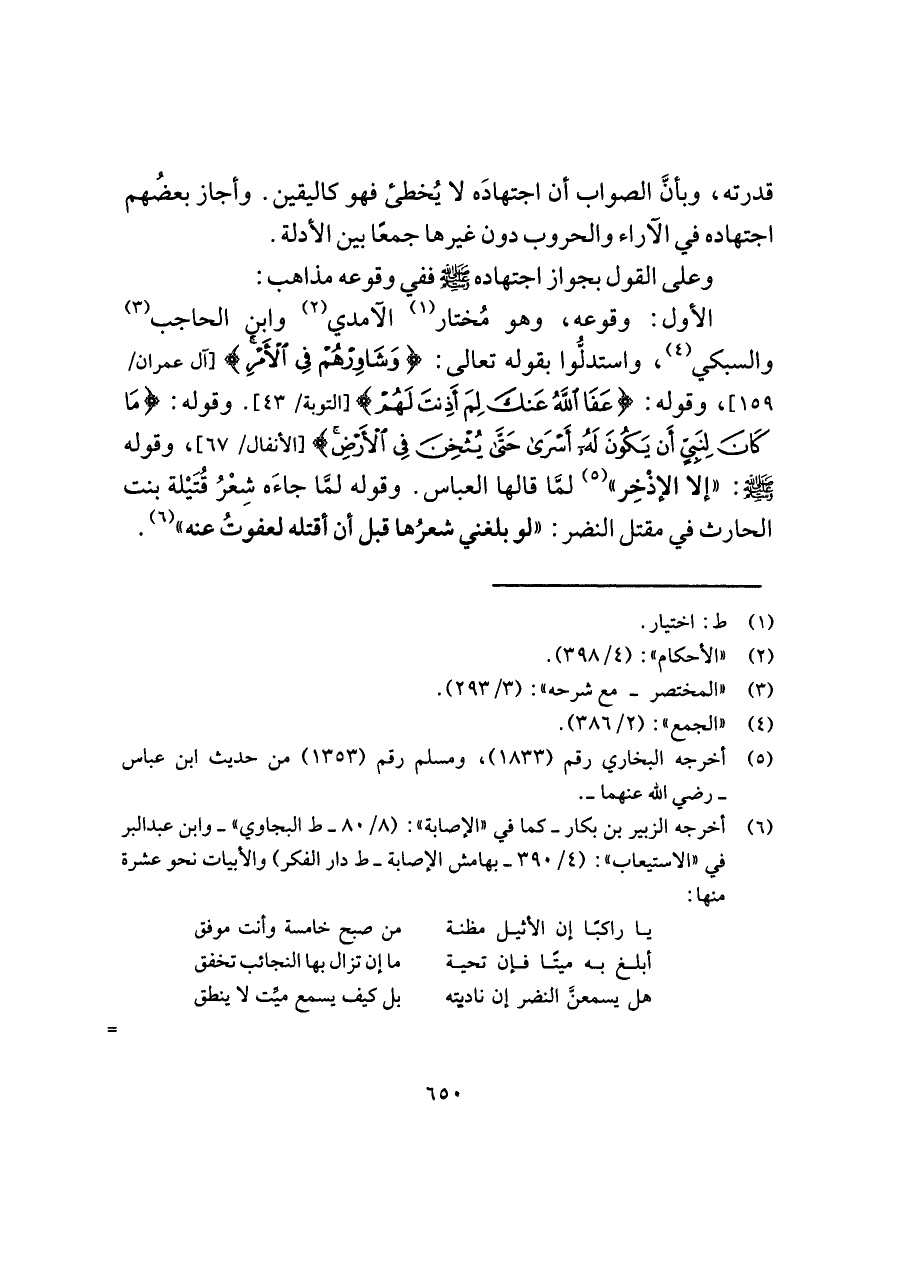 قدرته، وبأنَّ الصواب أن اجتهادَه لا يُخطئ فهو كاليقين. وأجاز بعضُهم اجتهاده في الآراء والحروب دون غيرها جمعًا بين الأدلة.