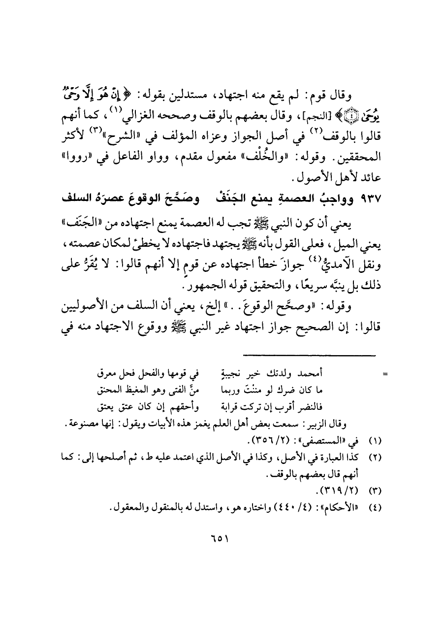 ٩٣٧ - وواجبُ العصمةِ يمنع الجَنَفْ ... وصَحَّحَ الوقوعَ عصرَة السلف