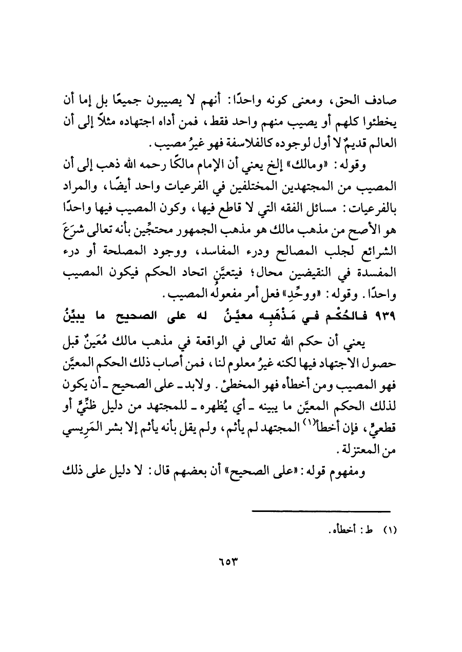 يعني أن حكم اللَّه تعالى في الواقعة في مذهب مالك مُعَينٌ قبل حصول الاجتهاد فيها لكنه غيرُ معلوم لنا، فمن أصاب ذلك الحكم المعيَّن فهو المصيب ومن أخطأه فهو المخطئ. ولابد -على الصحيح- أن يكون لذلك الحكم المعيَّن ما يبينه -أي يُظهره- للمجتهد من دليل ظنِّيٍّ أو قطعيٍّ، فإن أخطأ (¬١) المجتهد لم يأثم، ولم يقل بأنه يأثم إلا بشر المَرِيسي من المعتزلة.