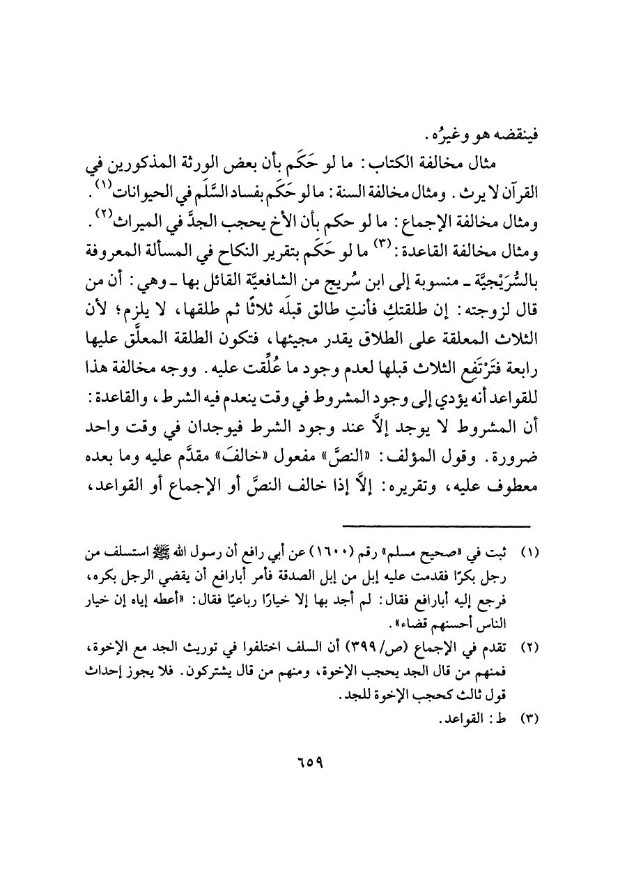 مثال مخالفة الكتاب: ما لو حَكَم بأن بعض الورثة المذكورين في القرآن لا يرث. ومثال مخالفة السنة: ما لو حَكَم بفساد السَّلَم في الحيوانات (¬١). ومثال مخالفة الإجماع: ما لو حكم بأن الأخ يحجب الجدَّ في الميراث (¬٢). ومثال مخالفة القاعدة: (¬٣) ما لو حَكَم بتقرير النكاح في المسألة المعروفة بالسُّرَيْجيَّة -منسوبة إلى ابن سُريج من الشافعيَّة القائل بها- وهي: أن من قال لزوجته: إن طلقتكِ فأنتِ طالق قبلَه ثلاثًا ثم طلقها، لا يلزم؛ لأن الثلاث المعلقة على الطلاق يقدر مجيئها، فتكون الطلقة المعلَّق عليها رابعة فتَرْتَفِع الثلاث قبلها لعدم وجود ما عُلِّقت عليه. ووجه مخالفة هذا للقواعد أنه يؤدي إلى وجود المشروط في وقت ينعدم فيه الشرط، والقاعدة: أن المشروط لا يوجد إلَّا عند وجود الشرط فيوجدان في وقت واحد ضرورة. وقول المؤلف: "النصَّ" مفعول "خالفَ" مقدَّم عليه وما بعده معطوف عليه، وتقريره: إلَّا إذا خالف النصَّ أو الإجماع أو القواعد،