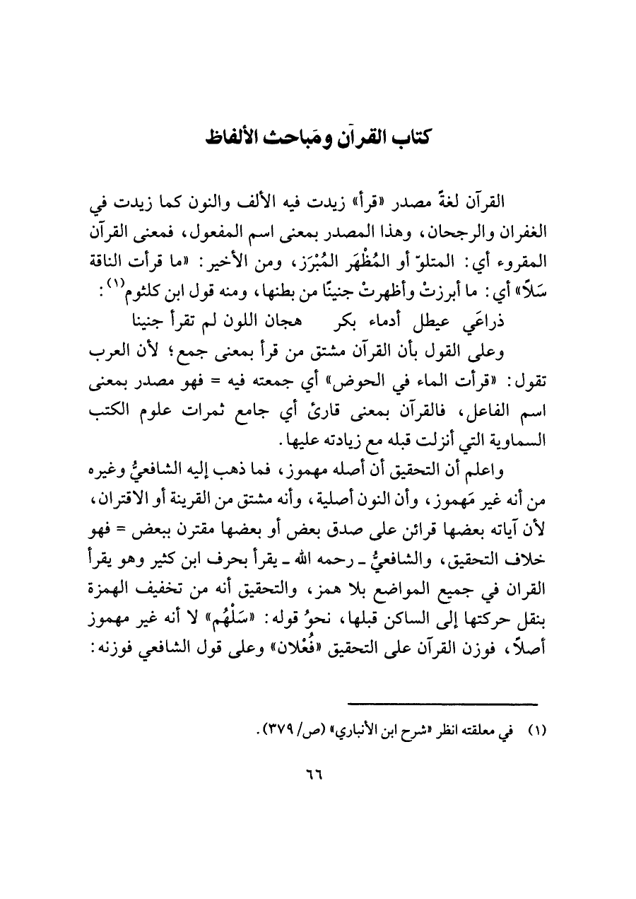 واعلم أن التحقيق أن أصله مهموز، فما ذهب إليه الشافعيُّ وغيره من أنَّه غير مَهموز، وأن النون أصلية، وأنه مشتق من القرينة أو الاقتران، لأن آياته بعضها قرائن على صدق بعض أو بعضها مقترن ببعض = فهو خلاف التحقيق، والشافعيُّ -رحمه اللَّه- يقرأ بحرف ابن كثير وهو يقرأ القرآن في جميع المواضع بلا همز، والتحقيق أنَّه من تخفيف الهمزة بنقل حركتها إلى الساكن قبلها، نحوُ قوله: "سَلْهُم" لا أنَّه غير مهموز أصلًا، فوزن القرآن على التحقيق "فُعْلان" وعلى قول الشافعي فوزنه:
